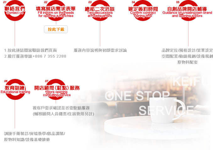 不管你是做早餐、泡沫或小吃油湯類的老闆,只要來開富即可得到所有的服務(原物料、設備動線、店鋪營運、裝潢配置、飲品技術)