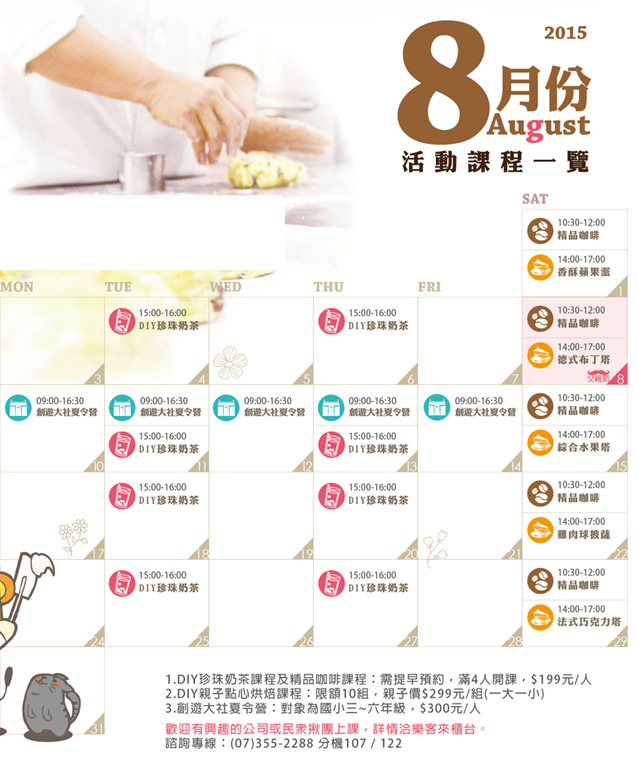 8月份週六烘焙課程已全數額滿囉!另外有『DIY手作珍珠奶茶』『精品咖啡教學』課程,歡迎直接至樂客來報名。