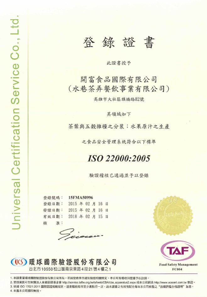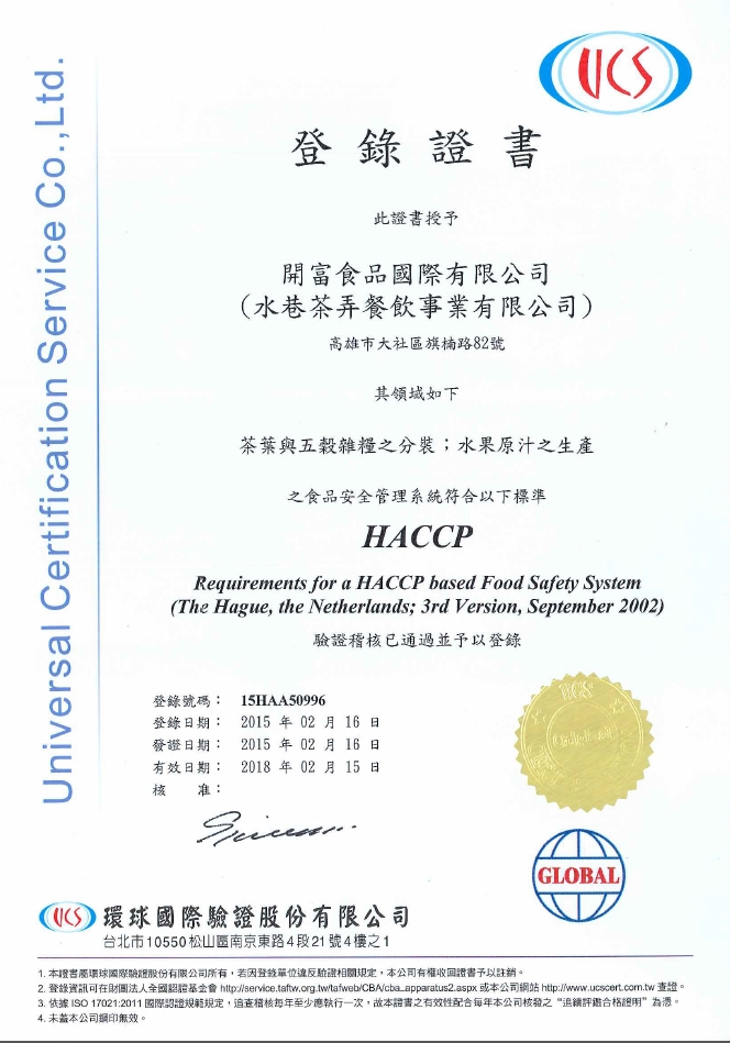 【開富食品國際股份有限公司】通過ISO22000、HACCP國際食品驗證